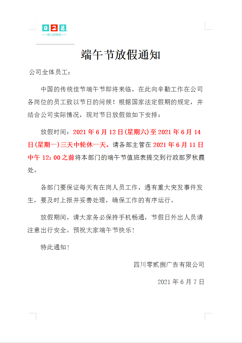 放假時間:2021年6月12日(星期六)至2021年6月14日(星期一)三天中輪休一天。請各部主管在2021年6月11日中午12:00之前將本部門的端午節(jié)值班表提交到行政部羅秋霞處。各部門要保證每天有在崗人員工作,遇有重大突發(fā)事件發(fā)生,要及時上報并妥善處理,確保工作的有序運行。放假期間,請大家務(wù)必保持手機暢通,節(jié)假日外出人員請注意出行安全預(yù)祝大家端午節(jié)快樂!