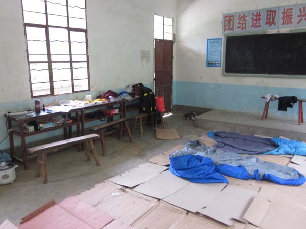 志愿者的“賓館”,晚上在教室里打地鋪,白天收起來上課。